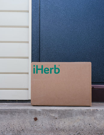 Tambov, Russian Federation - February 05, 2022 iHerb cardboard box delivered to the house door.