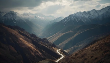 Serene mountain road winding through a valley. Breathtaking landscape photography.
