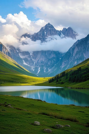 A stunning mountain landscape featuring towering peaks under a clear blue sky. Gentle mist hovers over the valley, creating a serene and peaceful atmosphere, perfect for nature enthusiasts and travelers.