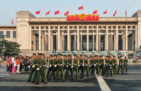 Beijing,China - October 4 ,2015 : Team of soldier walk at Tiananmen square near Forbidden city in Beijing,China.It is located in the center of Beijing, China, and now houses the Palace Museum.
