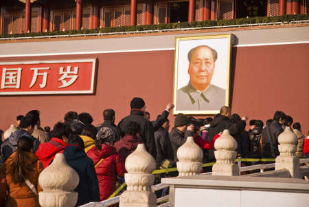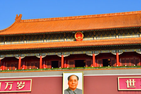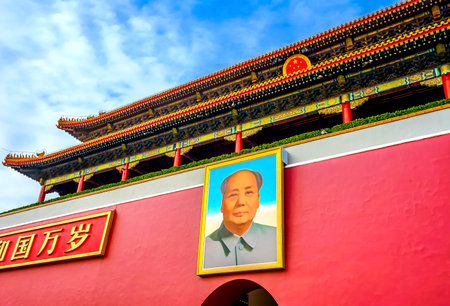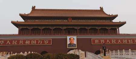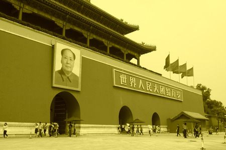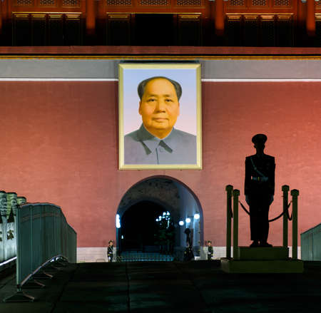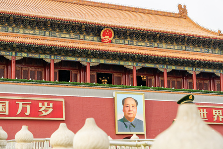 Chairman Mao portrait on the Gate of Heavenly Peace in Tiananmen Square in Beijing in the Peoples Republic of China - The architect and founding father of the People