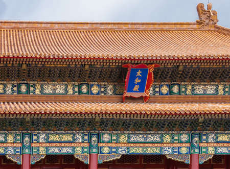 Beijing, China - April 27, 2010: Forbidden City. Closeup of highly decorated gold, orange and maroon roof structure against light blue sky. Traditional designs on beams.