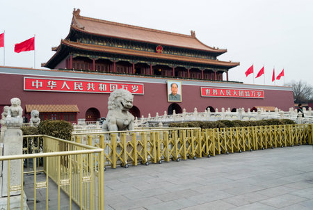 Beijing, China - November 19, 2019: Tiananmen Square - Gate of Heavenly Peace on a hazy day. The entrance gate to the forbidden city. protected with golden barrier.