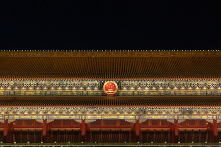Close-up of Tiananmen Gate with archiectural details and national emblem of China, at night, in Beijing, China