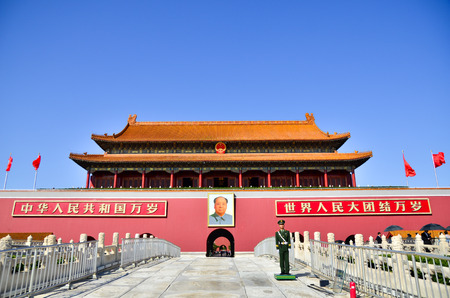 Beijing, China, October 13, 2013 A soldier stands guard in front of Forbidden City in Beijing with a portrait of Mao Zedong
