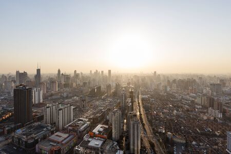 Aerial view of Shanghai Pudong skyline at sunset, China