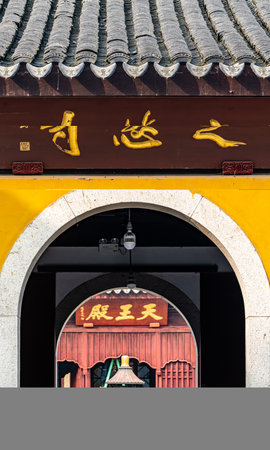 A Chinese traditional pavilion of main gate in the Putuoshan, Zhoushan Islands, a renowned site in Chinese bodhimanda of the bodhisattva Avalokitesvara (Guanyin)