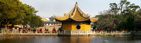 Nanxun, Zhejiang, China - 24 May 2019: Tourists entering traditional Taoist Temple of Huangdaxian in Nanxun Old Town