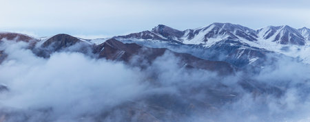 Mountain landscape with clouds and fog in the morning. Caucasus, Russia