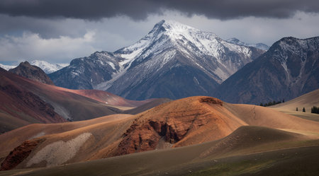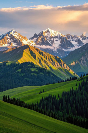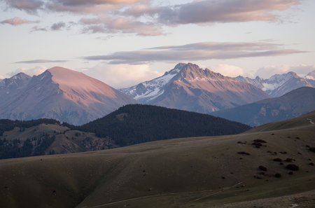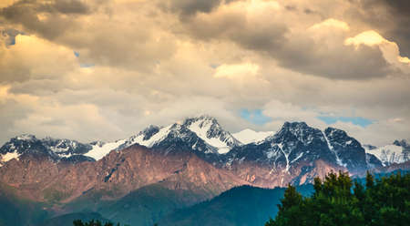 High snowy mountains at sunset in Almaty, Kazakhstan