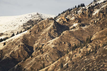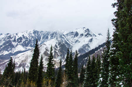Beautiful view of the snow-covered mountain slopes. Tian Shan, Kazakhstan. Fir forest in the foreground