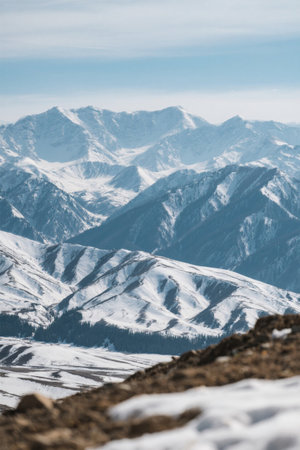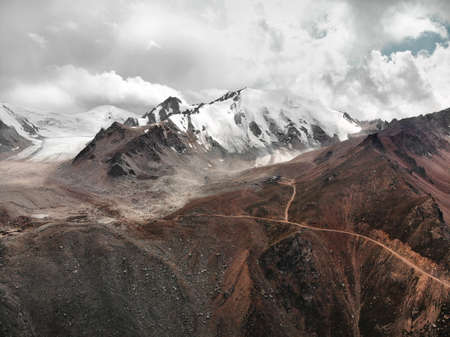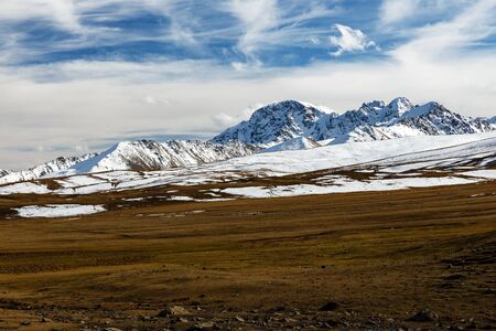 snowy mountain peaks on the Ala Bel pass, Bishkek Osh Highway M41 in Kyrgyzstan