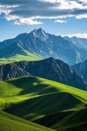 Beautiful nature landscape with high mountains and cloudly skyscape.