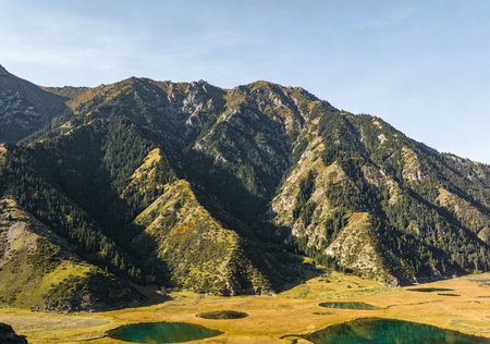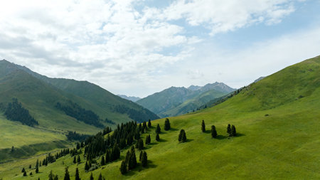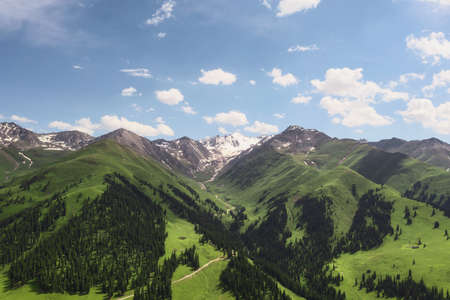 Aerial panorama view of the mountain valley in Tien Shan mountains in Almaty Kazakhstan.
