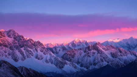 View of beautiful mountains in northern caucasus in the evening with pink sky