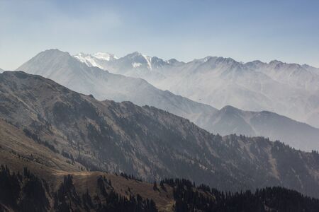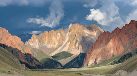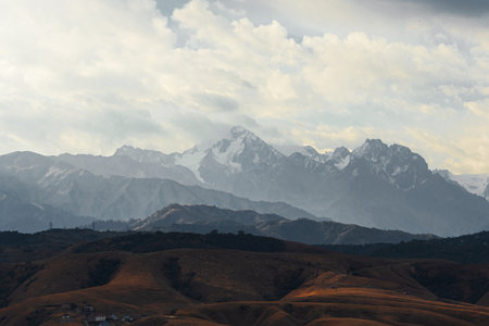 Amazing Natural View with mountains against blue sky. Hiking Concept. Kyrgyz Ala-Too mountain range.
