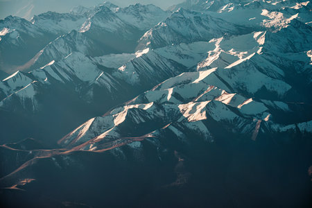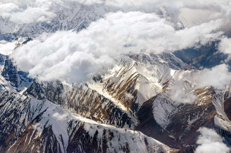 Above of cold and snow capped Himalayan mountain peaks in Tibet area
