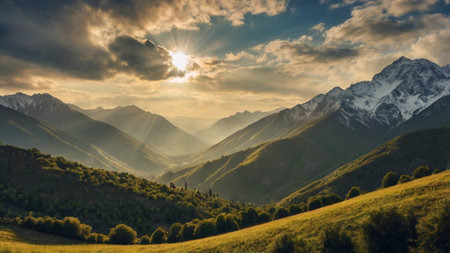Mountain landscape at sunset, Kyrgyzstan, Dzhuku Valley