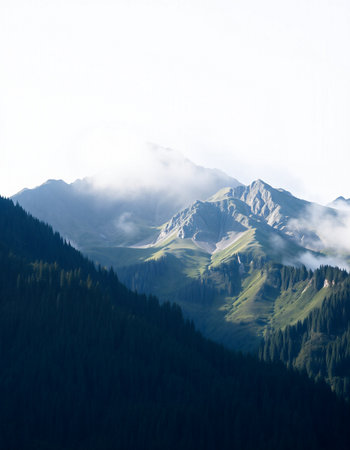 Beautiful scenery of the high and green mountains covered with pine trees.