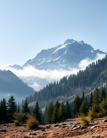 valley with pine forest and rocky peaks on horizon, mountain tourism, outdoor relaxation