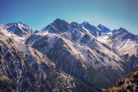 Landscape of snow-capped peaks of the rocky mountains in Sunny weather. The concept of nature and travel