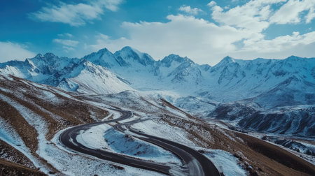 Scenic view of a serpentine road through high-altitude terrain with snow-capped peaks. Ideal for winter travel and outdoor content