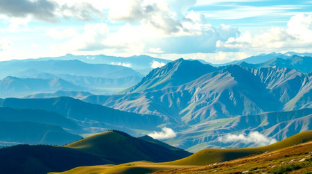 This stunning valley landscape captures the essence of nature's beauty, featuring rolling hills, lush greenery, and misty mountains under a serene sky.