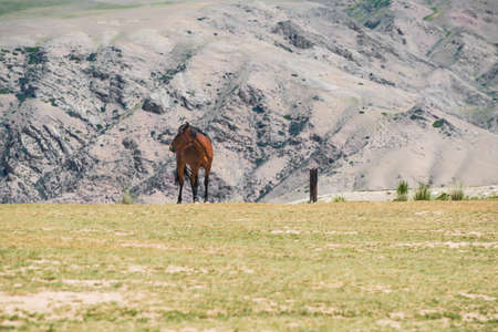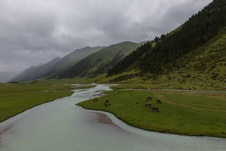 Horses grazing in a meadow in the mountains of Kyrgyzstan