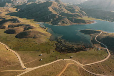 Aerial view of a path leading to an impressive mountain landscape in Turkey. Picturesque view