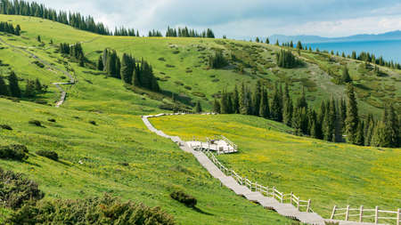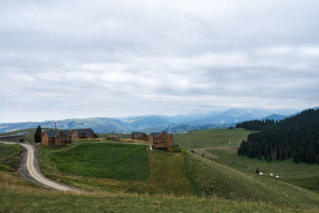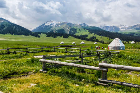 A magnificent landscape of traditional pastures of the nomadic peoples of Asia. Yurt in the pasture. Assy plateau. Kazakhstan