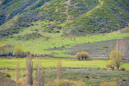 Mountain landscape with grassland and sheep, Kyrgyzstan