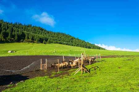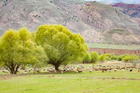 A small flock of sheep in the paddock on a Sunny summer day, Kyrgyzstan.