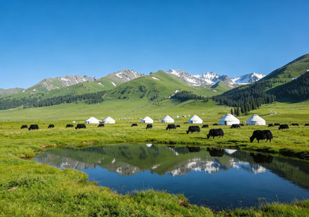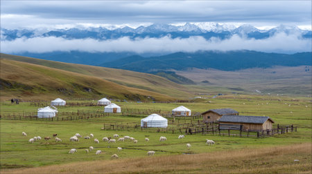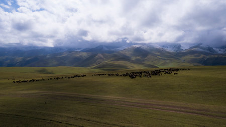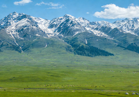 Steppe near Songkol lake. Vast pasture with grazing horses, traditional yurt and epic mountains in far background.
