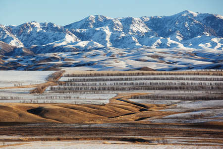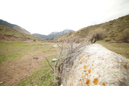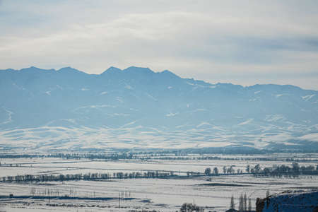 Mountains with melting snow. The end of winter, the beginning of spring. Kyrgyzstan Tourism and travel