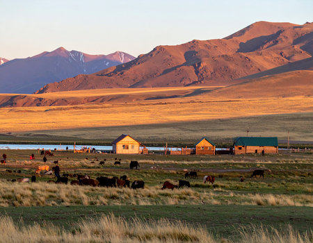 Mountains and cattle around Song Kul lake in a sunrise sun, Kyrgyzstan