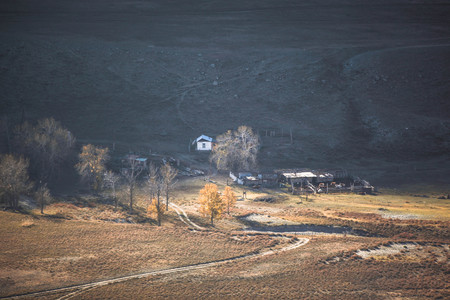 Autumn in the valley of the Kyzylshin River, view from the top of the hill. Kosh-Agachsky District, Altai Republic, Russia