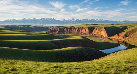 A natural landscape featuring undulating, vibrant green hills that roll towards a dramatic red rock canyon. A serene, winding river flows through the valley, reflecting the blue sky and wispy white clouds. In the distance, snow-capped mountains form a backdrop under the soft light of early morning or late afternoon. The scene captures the raw beauty and geological formations of the earth.