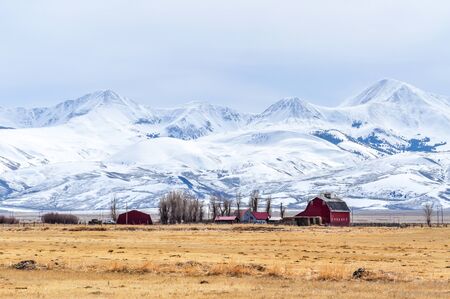 A Montana farm sits in a valley below the snow covered Bitterroot Mountains