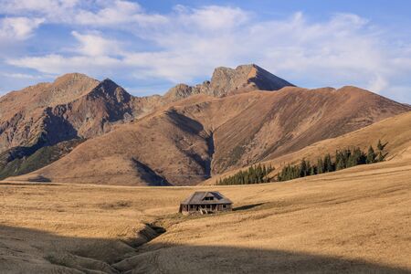 Mountain scenery with two small abandoned wooden hovels in the foreground and behind, surrounded by native grasses and pastures, fences; hill ridge in the background