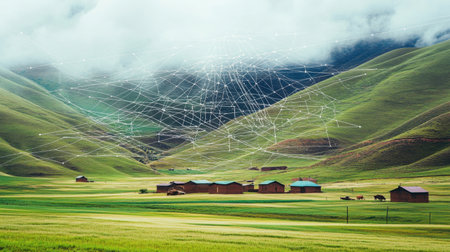 A picturesque rural landscape showcasing green hills and rustic cabins beneath a cloudy sky, enhanced by abstract connections that symbolize technology in nature.