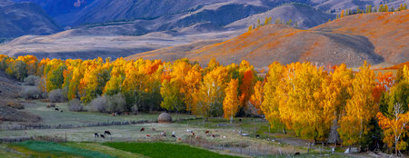 Mountain valley, golden autumn panorama landscape, Siberia, Altai Republic, Russia