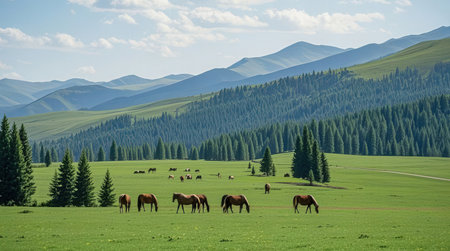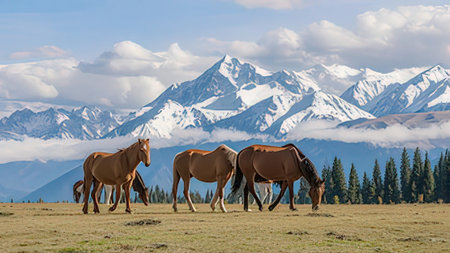 Horses in the meadow with mountains in the background, Kyrgyzstan