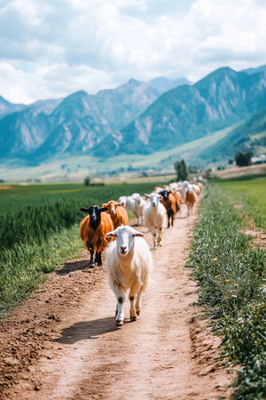 A gentle herd of goats makes its way down a rustic dirt path, flanked by lush green fields and distant, towering mountains under a clear sky, evoking a sense of peace.