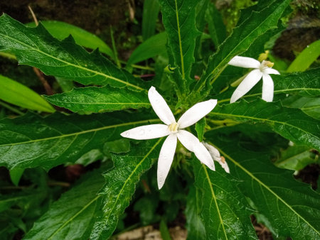 Close-up of a white tropical flower with water droplets on green leaves background.