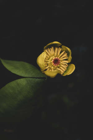 Green leaves and yellow flower floating in water
