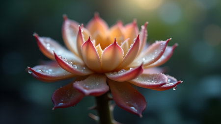 A close-up photograph showcasing the intricate details of a succulent plant with water droplets on its leaves.