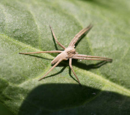 A female of spider tibellus oblongus sits on a maple leaf awaiting prey