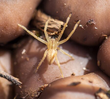 A female of spider tibellus oblongus sits on a gray stone waiting for prey