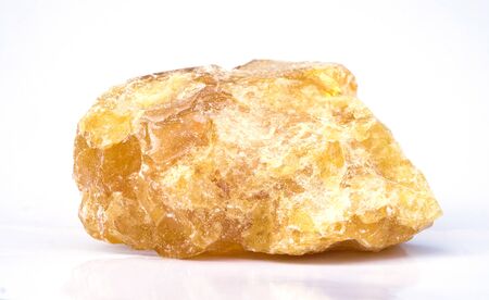 Rough yelow opal crystal, unpolished mineral. Close-up, black background
