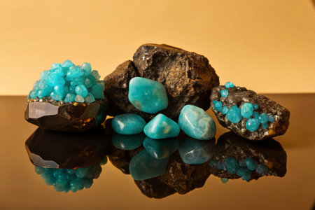 This image captures a vibrant collection of polished stones arranged in a beautiful configuration, reflecting on a smooth dark surface, embodying elegance and tranquility.